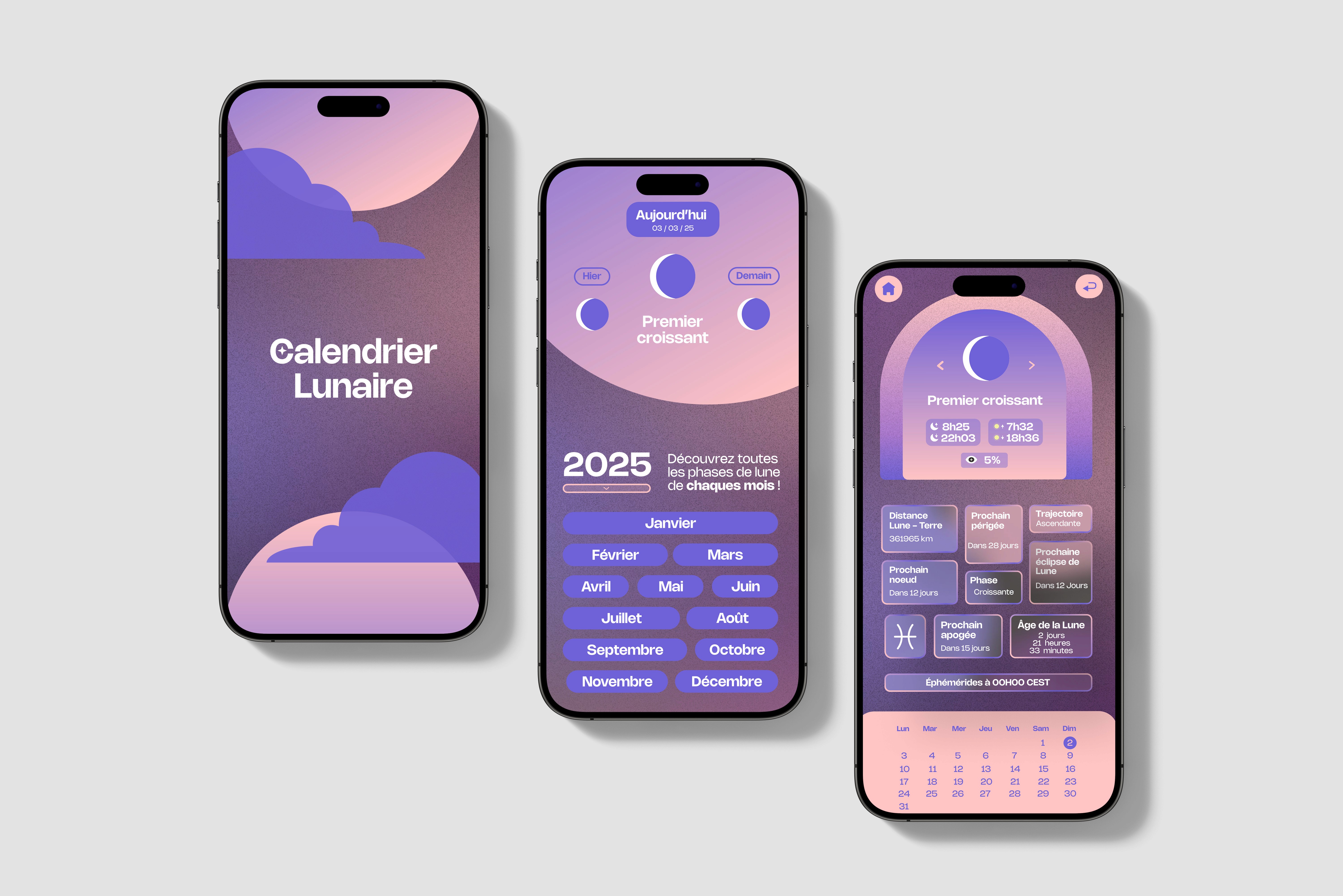 Étant moi-même peu documenté sur l’univers des calendriers lunaires, j’ai rencontré des difficultés pour déterminer quelles informations étaient essentielles et lesquelles pouvaient être secondaires. Cette étape a nécessité de nombreuses recherches et de consulter plusieurs sources afin de hiérarchiser les données et de proposer un contenu à la fois précis, clair et accessible pour les utilisateurs.