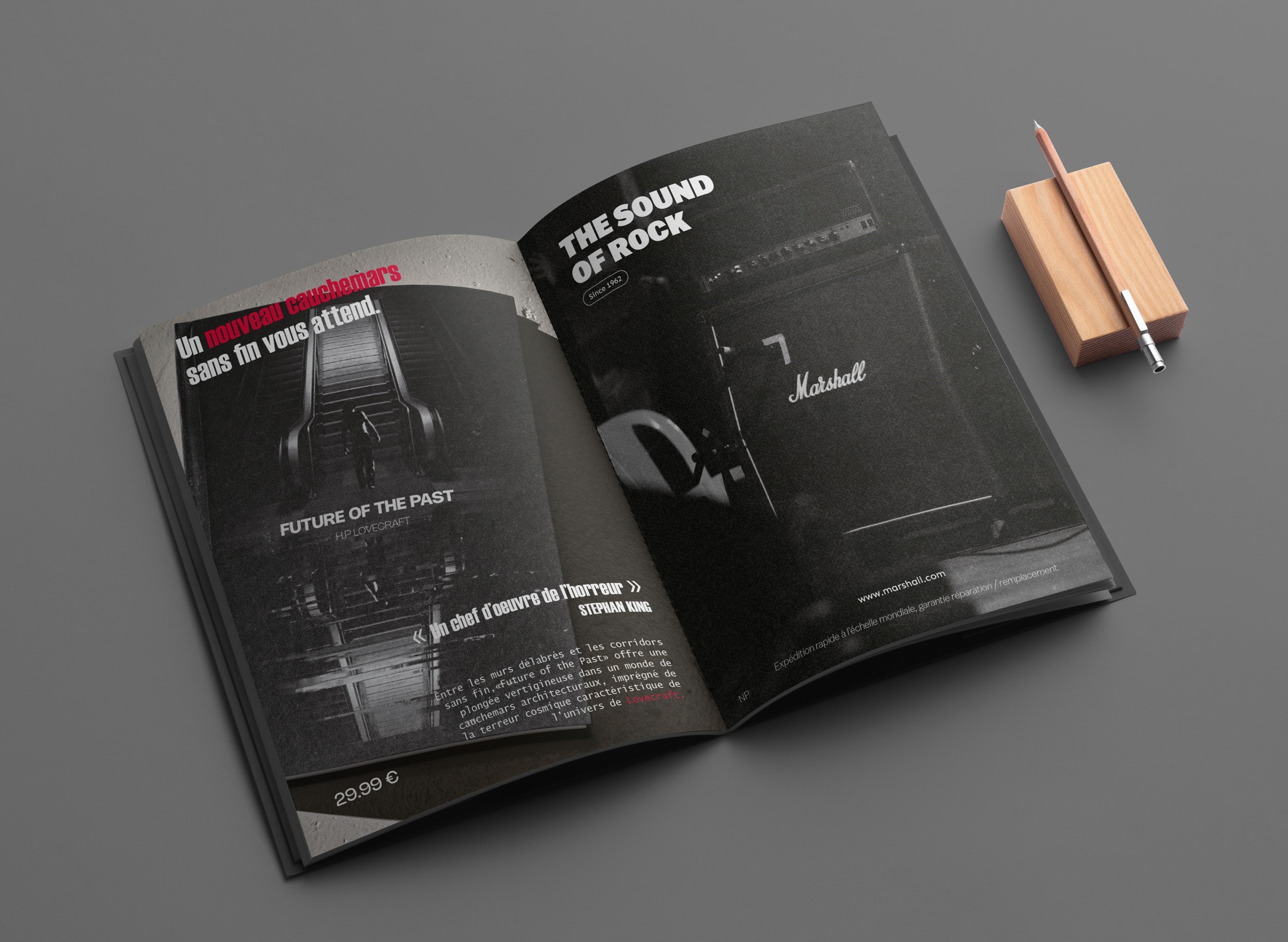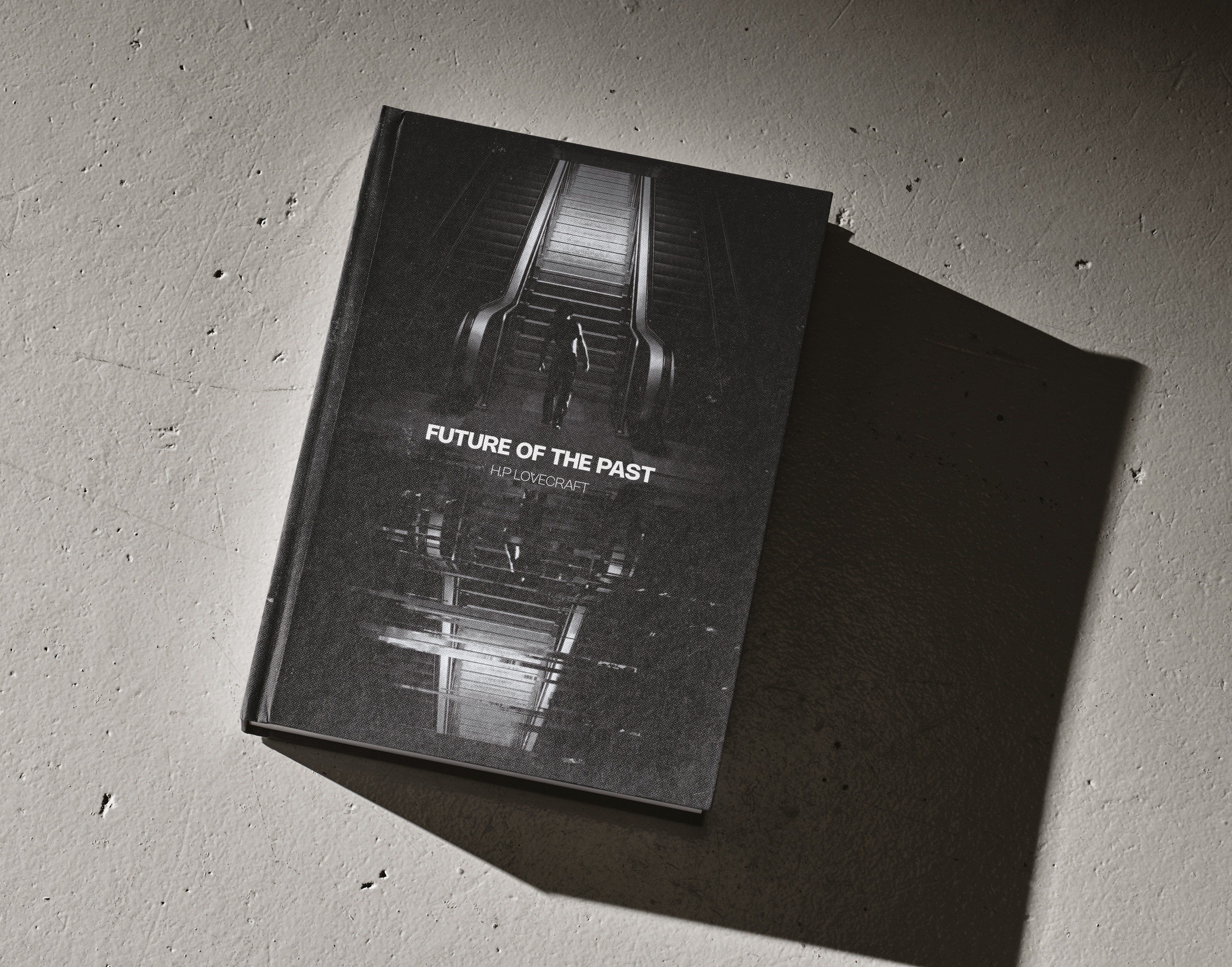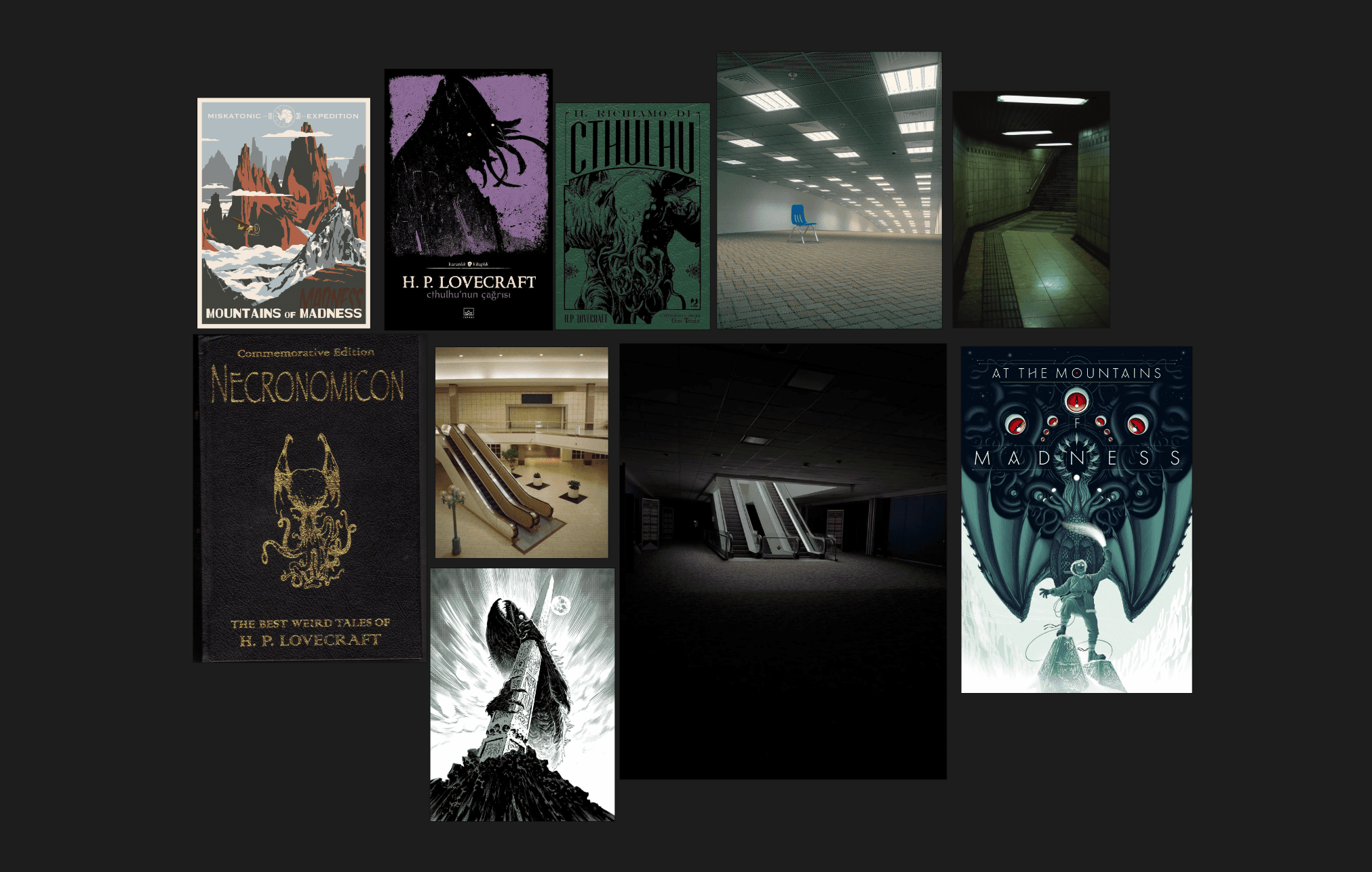 Ce projet fut imaginé comme un ancien ouvrage retrouvé de H.P Lovecraft, s’inspirant des images liminales. L'une de mes principales inspiration fut l'analyse de l'auteur Alt236 dans le livre Liminal : les nouveaux espaces de l’angoisse dans lequel j'ai pu comprendre cette univers et l'exploiter au mieux. Je suis parti sur un photomontage en noir et blanc afin d’y instaurer une atmosphère lourde et plus angoissante. Pour une version plus écologique, sans dénaturer l’esthétique de base, j’ai inversé les couleurs de l’image, incorporant davantage de blanc pour offrir une vision différente du même montage.