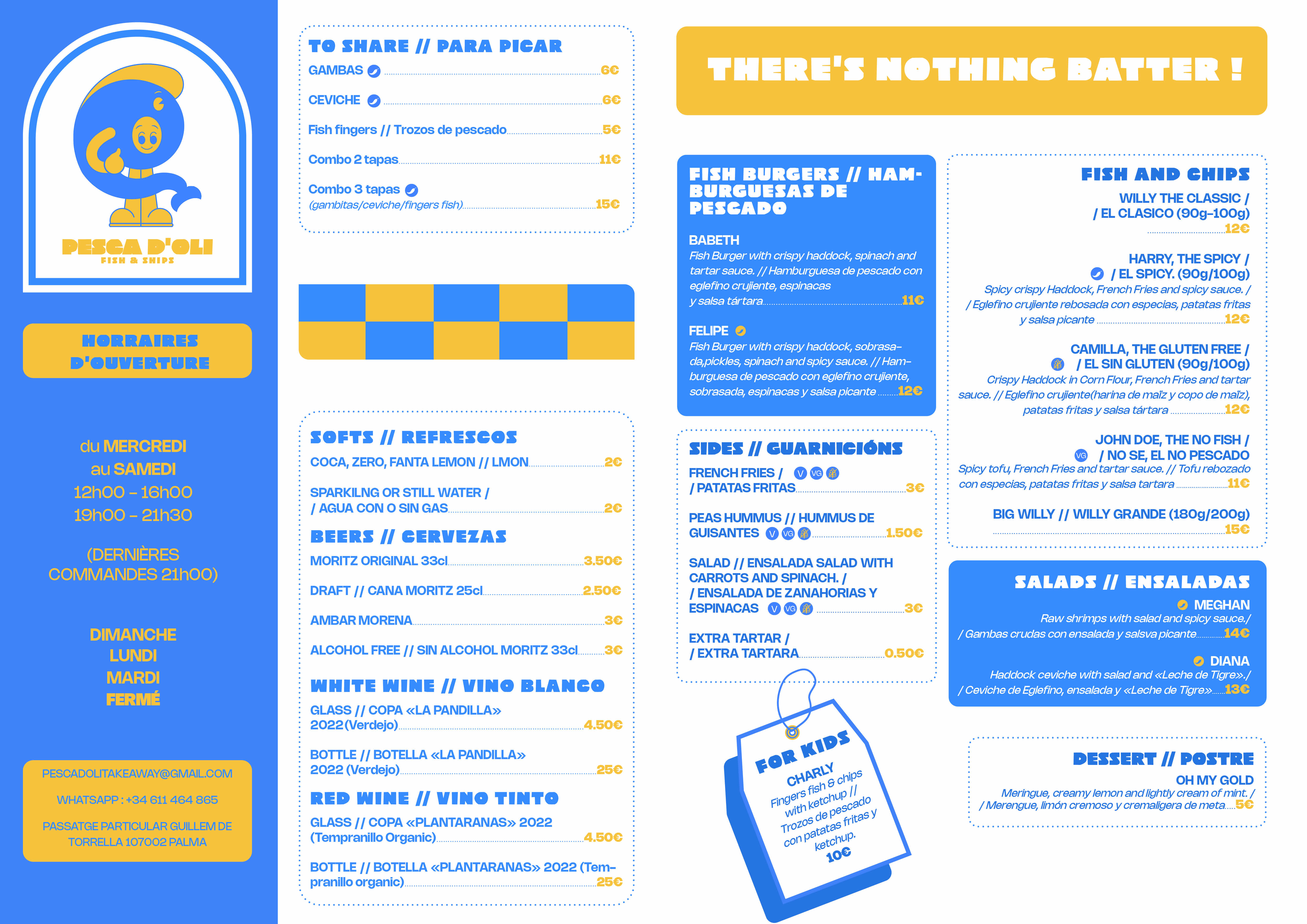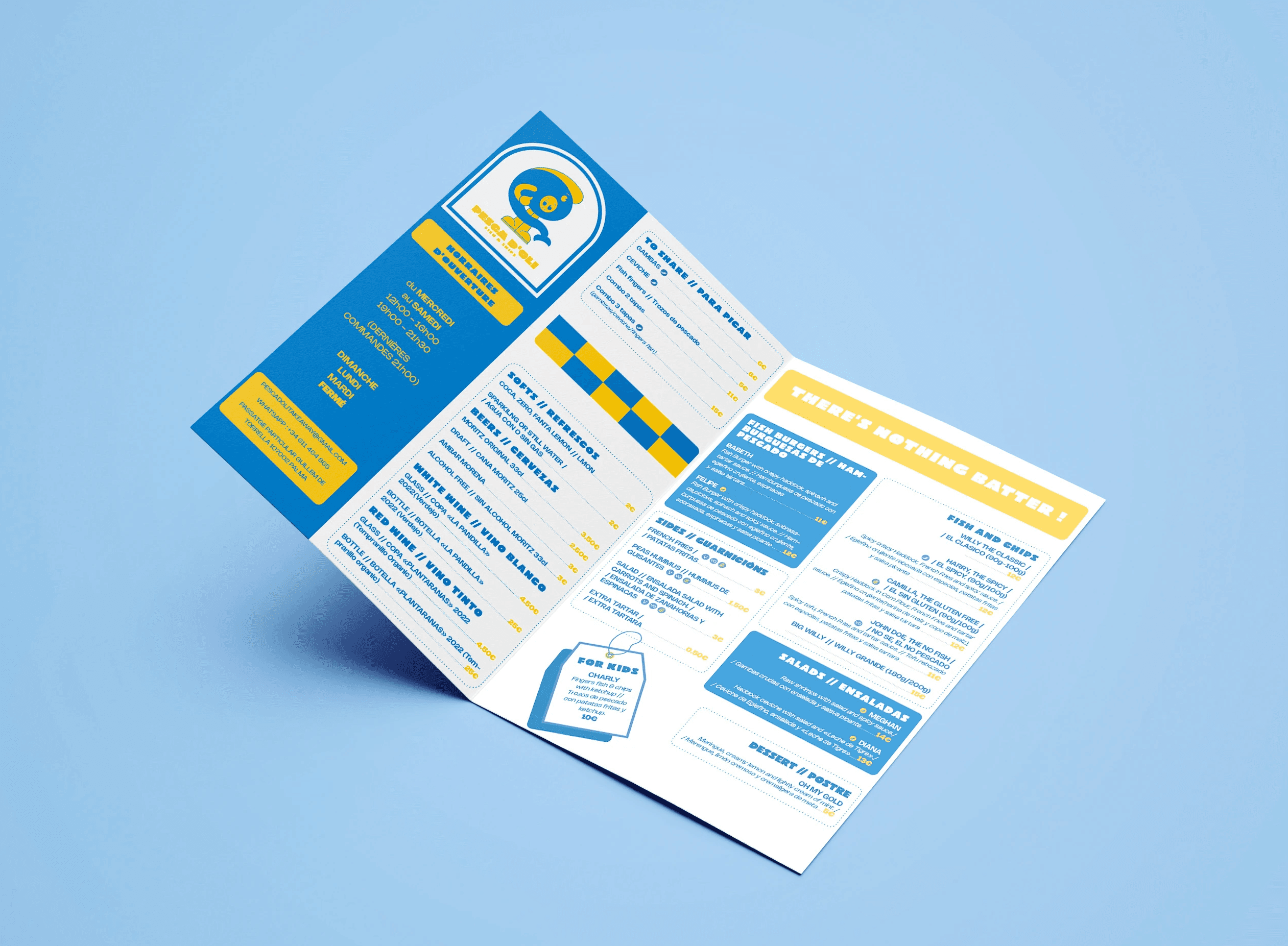 Mon défi était de créer une nouvelle identité graphique fictive pour Pesca d’Oli, restaurant de fish and chips à Palma de Majorque. L’objectif était de concevoir un univers visuel cohérent et attractif, reflétant les valeurs du restaurant : jeune, dynamique et esthétique. Le projet comprenait la création d’un logo en style doodle, ludique et moderne, ainsi que la conception du menu, pensé pour être à la fois fonctionnel et visuellement engageant. L’ensemble de l’identité devait transmettre la fraîcheur des produits, l’ambiance conviviale du lieu et capter l’attention d’un public curieux et branché.