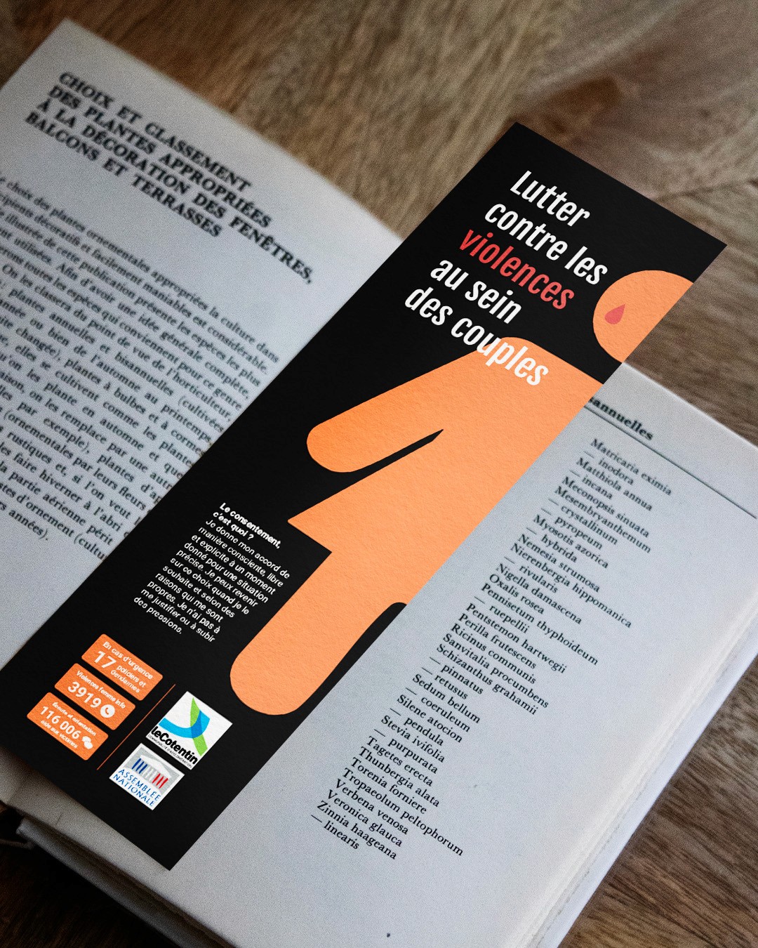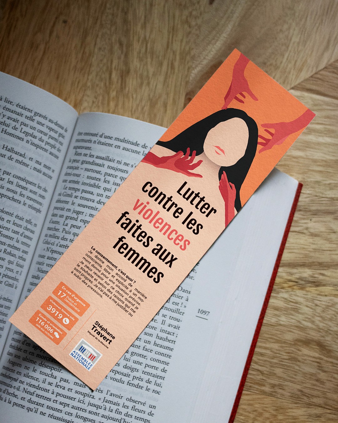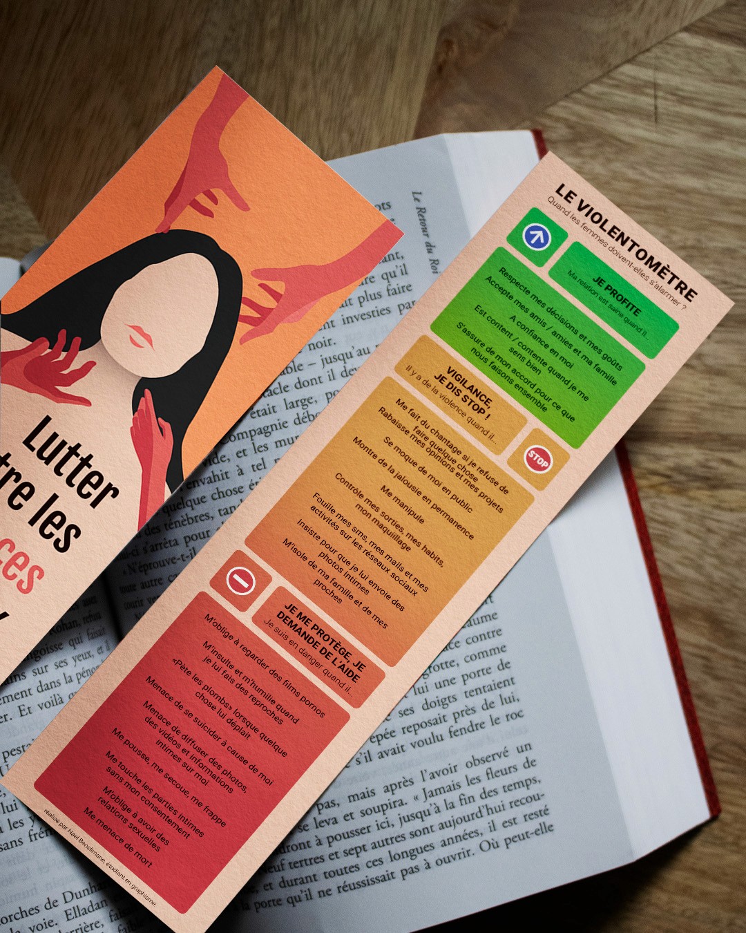 L’objectif principal de ce marque-page était de sensibiliser et d’informer sur les violences conjugales, et plus particulièrement sur celles faites aux femmes. Ce support, facile à transporter, permet à la fois d’accompagner les victimes en rappelant les numéros d’aide et en indiquant les comportements à adopter dans ces situations. Il vise également à attirer l’attention du grand public sur cette problématique, en rappelant l’importance de la prévention et du soutien envers les personnes concernées.