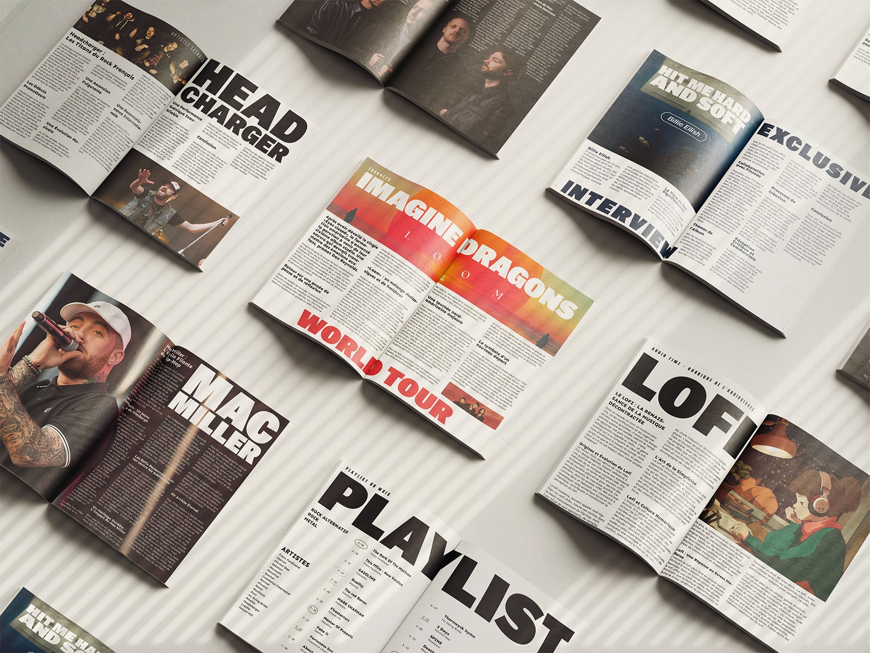 Les typographies jouent un rôle essentiel pour capter l’attention et renforcer l’identité du magazine. Des polices audacieuses et anguleuses évoquent l’énergie du rock et du métal, créant un impact visuel immédiat tout en guidant le lecteur à travers les différents contenus.
